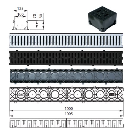 | Комплект (Лоток+Чугунная решетка) водоотводной 1000*146*120 пластиковый DN100 | 1500.00 |